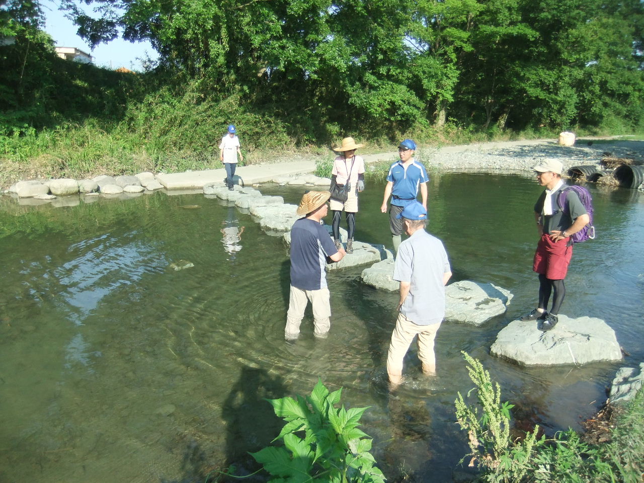 都幾川には東松山市~ときがわ町の間に8箇所、槻川には嵐山町~小川町~東秩父村の間に7箇所の飛び石・流れ橋が建設されており、その影響を見聞し調査するための現地見学会を、6月18日・土(都幾川)と7月31日・日(槻川)の両日に行った。